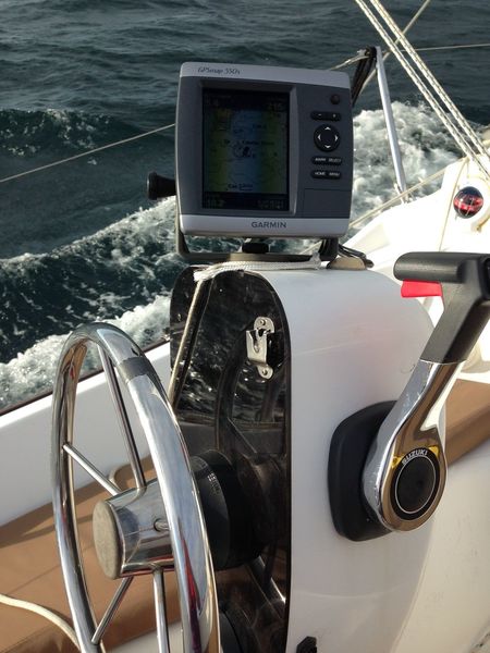 Great example of the usefulness of the AP. Cracking along at 6kts, close-reaching. Notice gaffer tape on the wheel denoting the centre position. The AP would put on about 1/4 rev to port during gusts to counter rounding; I then hang out the side